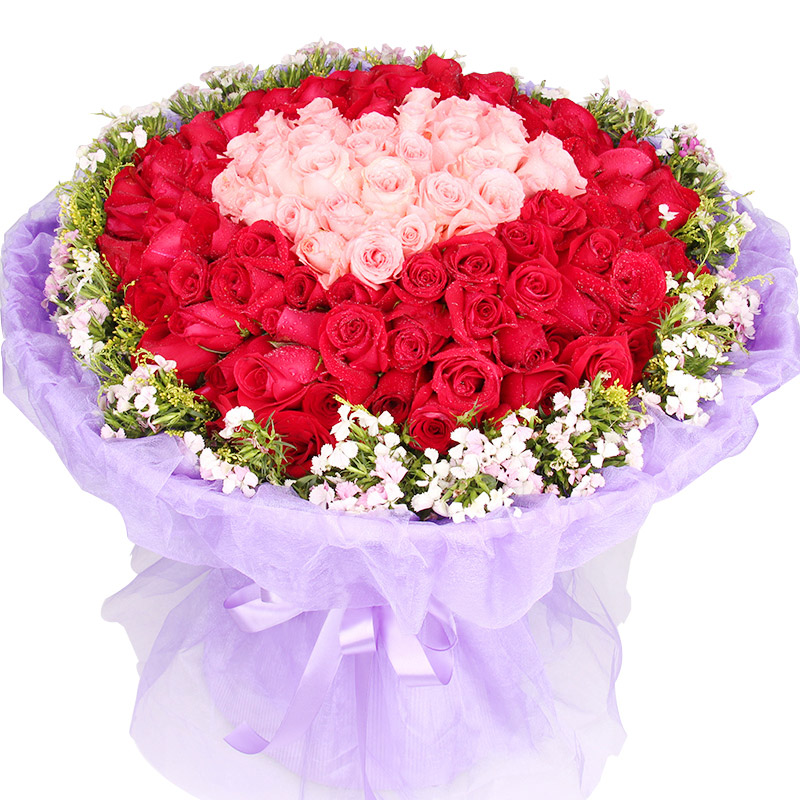 • 【袅袅爱意】精选99朵红色、粉色玫瑰,其中66朵粉荔枝玫瑰,33朵弗洛伊德红玫瑰,白色缎带装饰花面。