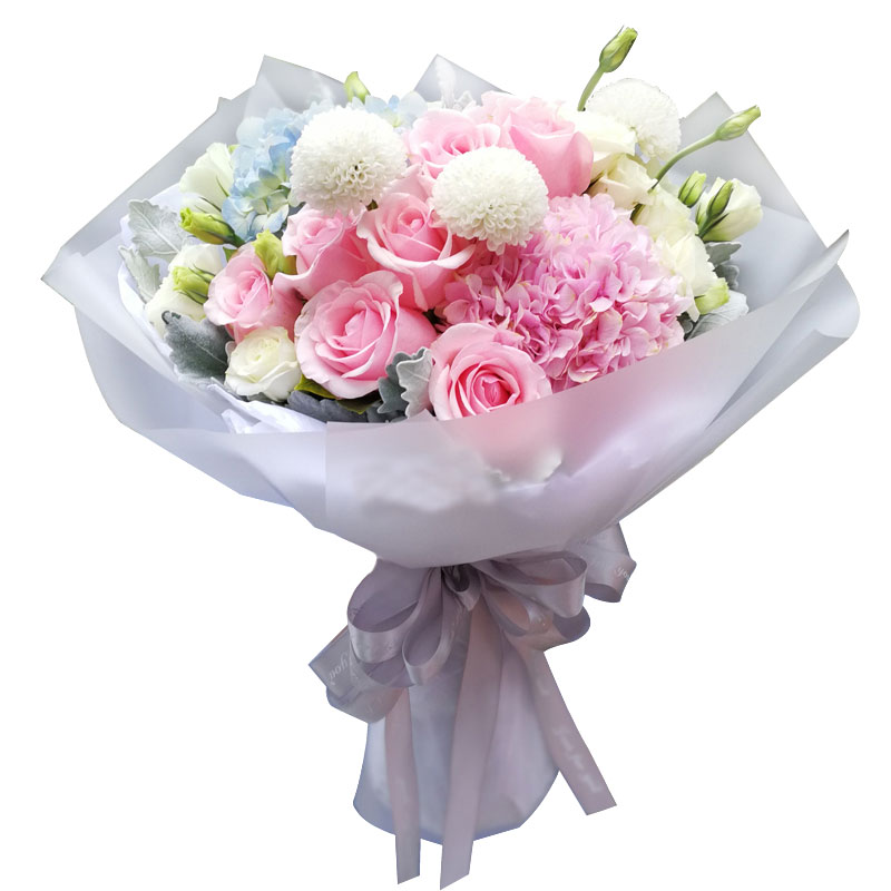 • 【时光旋律】两只绣球花,9支顶级粉色戴安娜,搭配大量桔梗、乒乓菊、银叶菊。