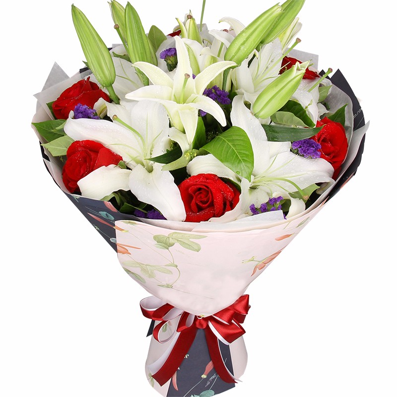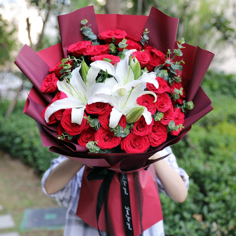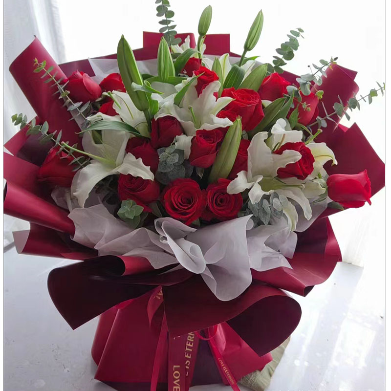 • 【不负韶华】红玫瑰、粉玫瑰混搭共11朵,白色、粉色多头香水百合共8支,搭配洋桔梗、尤加利叶装饰。