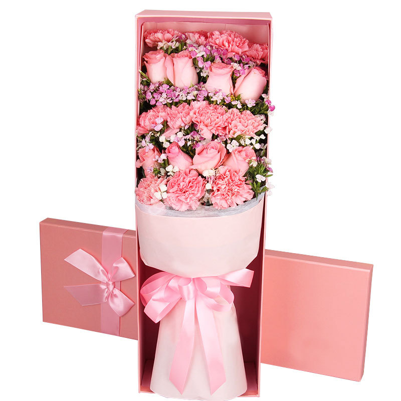 【星语星愿】19支粉玫瑰和粉色康乃馨混搭,2支多头白色香水百合,2支洋桔梗,搭配尤加利叶、洋甘菊等装饰。