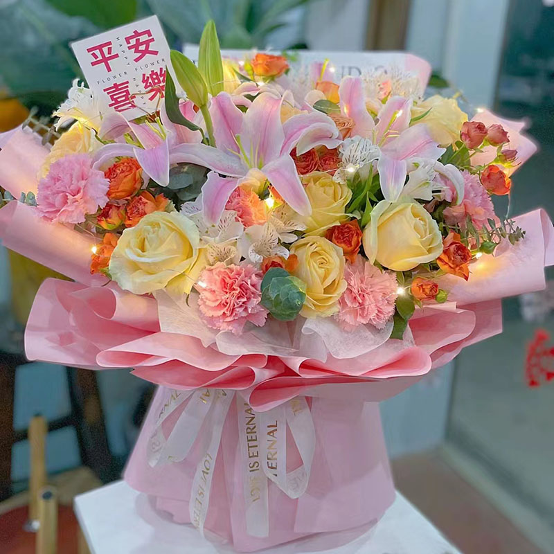 【清浅时光】香槟玫瑰和粉色康乃馨混搭共19朵,4支多头粉色香水百合,1条灯带,搭配8支橙色多头小玫瑰,洋桔梗,尤加利叶装饰。