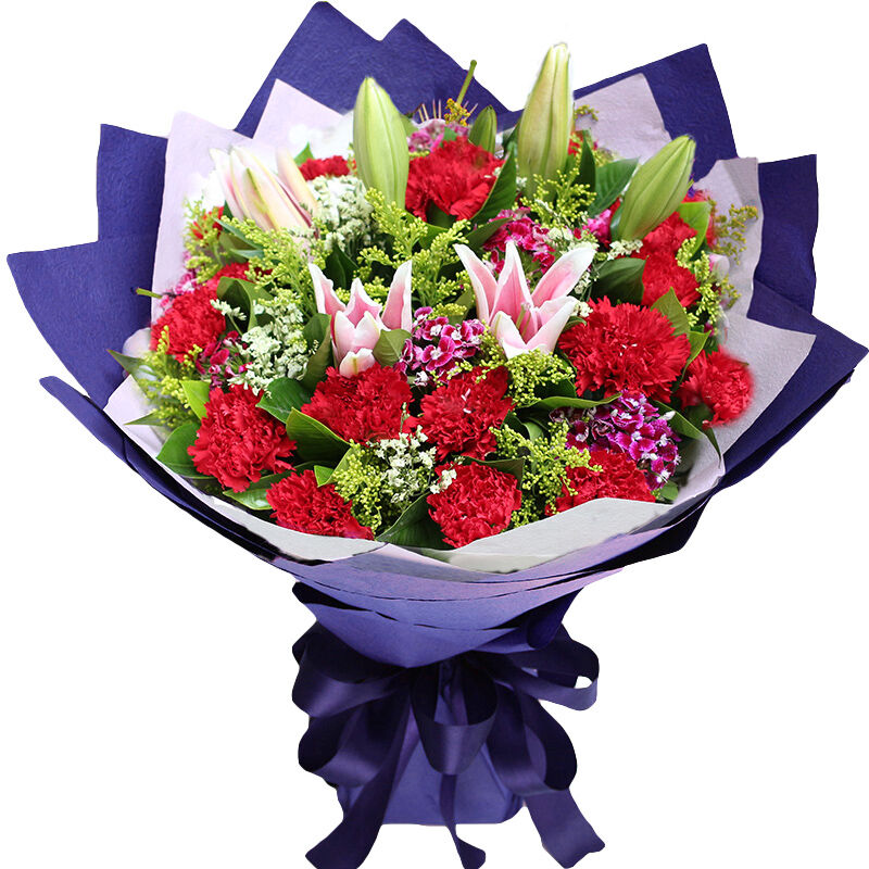 • 【花香满园】19朵精品红色康乃馨,2支粉色多头香水百合,搭配满天星,尤加利叶装饰。