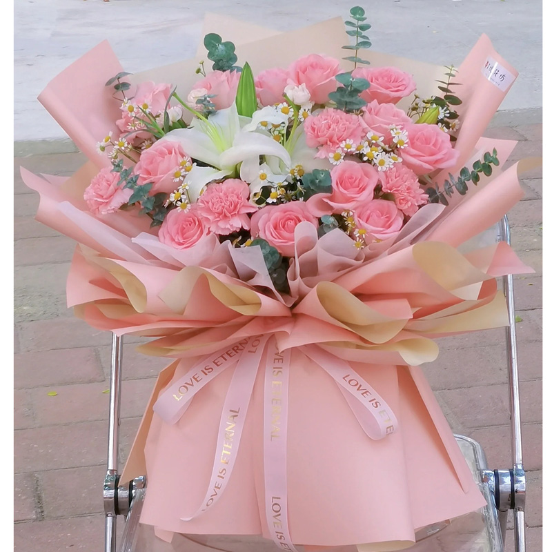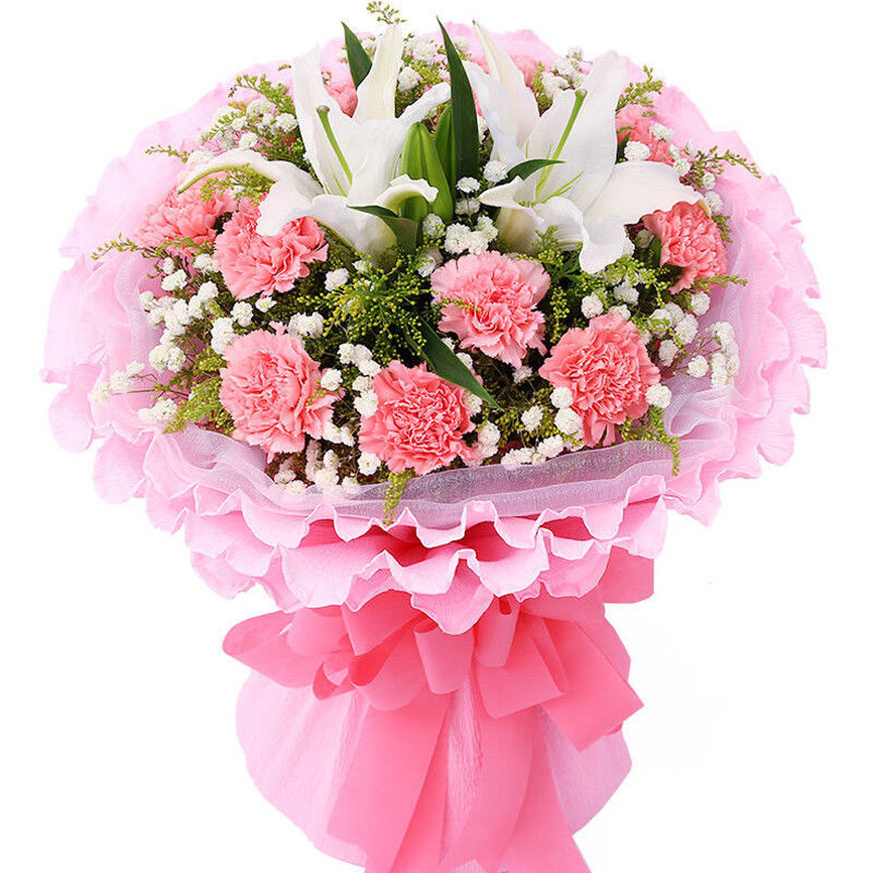 • 【星语星愿】19支粉玫瑰和粉色康乃馨混搭,2支多头白色香水百合,2支洋桔梗,搭配尤加利叶、洋甘菊等装饰。