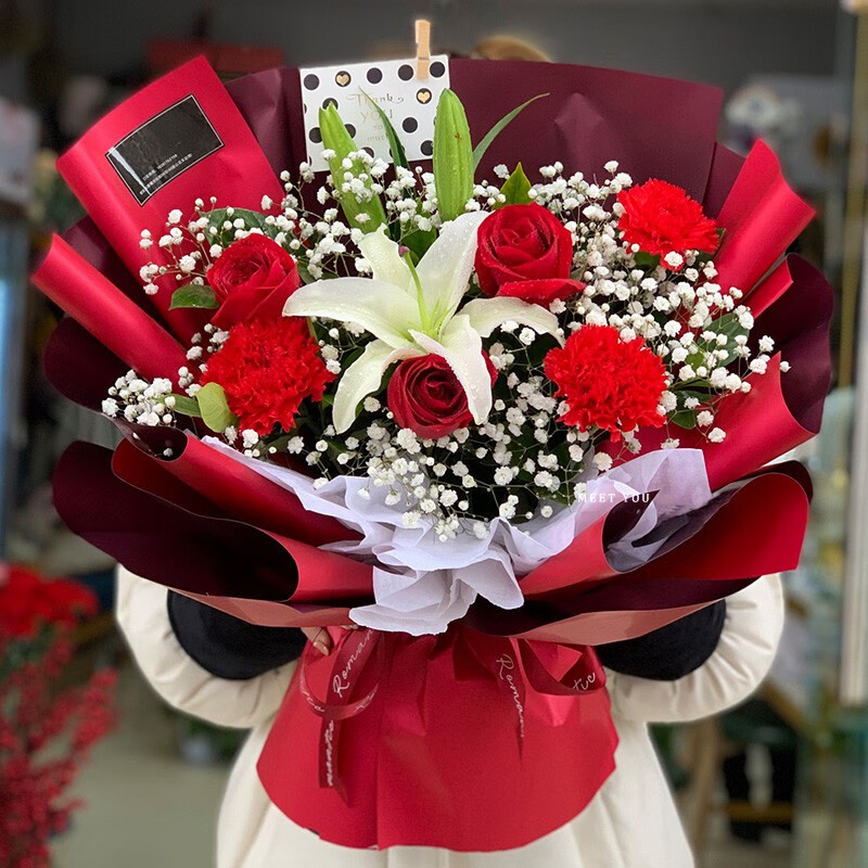 • 【最好的时光】16支红色康乃馨,3朵红玫瑰,2支白色多头百合,搭配适量满天星、绿叶。