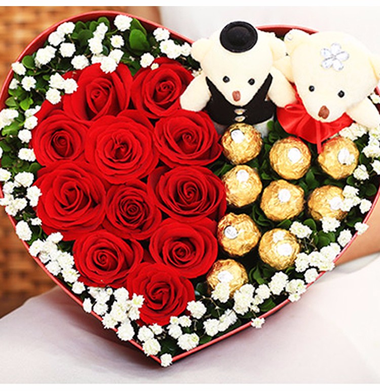 【心有灵犀】11朵精品红玫瑰,11朵费列罗,2只可爱小熊,满天星、栀子叶装饰。