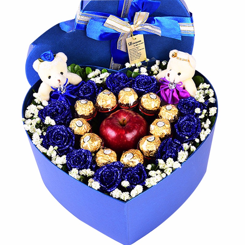 【就是喜欢你】11朵蓝色妖姬、11颗费列罗巧克力、1颗红苹果、2只可爱小熊,搭配适量白色满天星、绿叶装饰。
