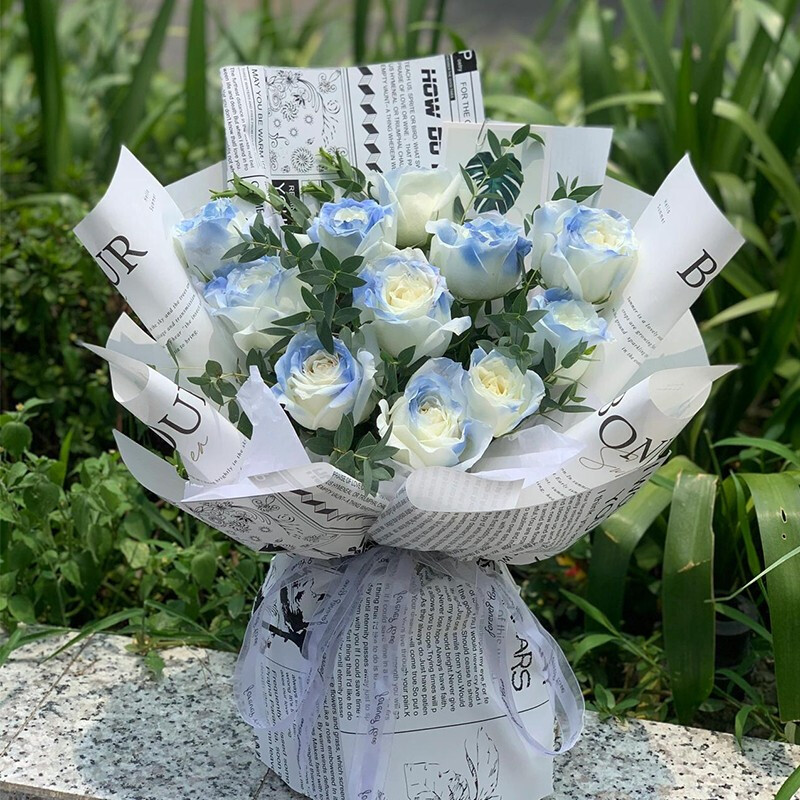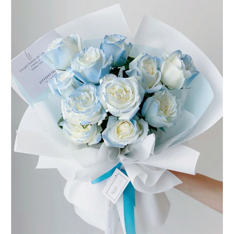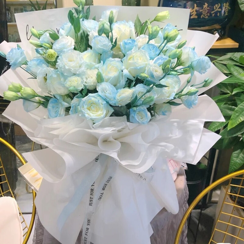 【晚风告白】15枝碎冰蓝玫瑰,5枝多头白桔梗,尤加利叶间插点缀。