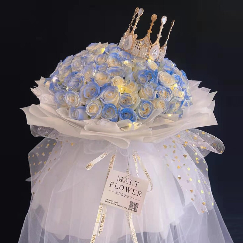【此生一诺】99朵极品碎冰蓝玫瑰球形包装,搭配皇冠,灯串装饰。(珍贵稀少花材,请提前预订或咨询花艺师)