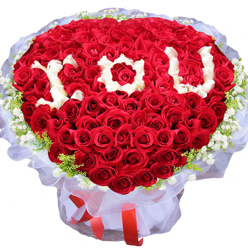 【爱一直都在】精选红玫瑰、白玫瑰共99枝,白玫瑰中间围成IOU的图案,外围满天星黄莺点缀。
