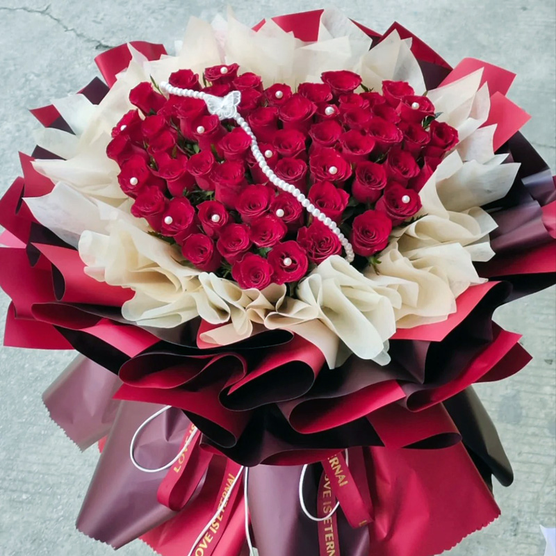 【执之子手 】精心挑选52朵红玫瑰,1条珠串,珍珠工艺品装饰花面。