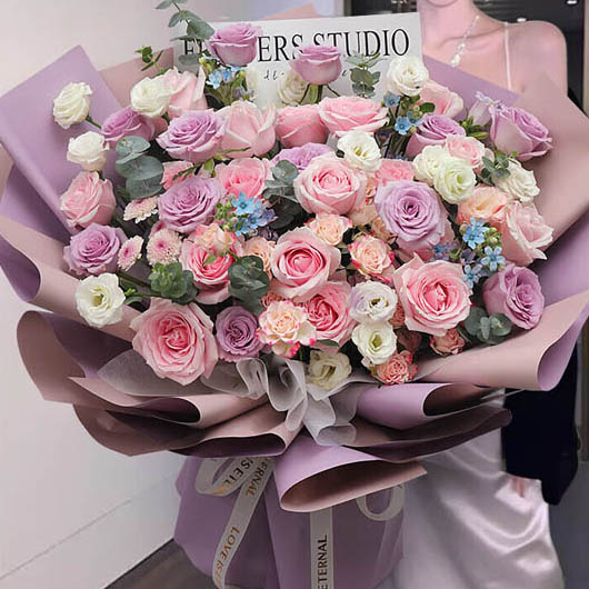 【芬芳花语】粉玫瑰、紫玫瑰共33朵,搭配多头折射小玫瑰,洋桔梗,小雏菊,蓝星花,尤加利装饰。