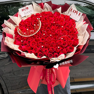 【世纪爱恋】99支顶级红玫瑰心形造型,1个皇冠(款式随机),满天星环绕。