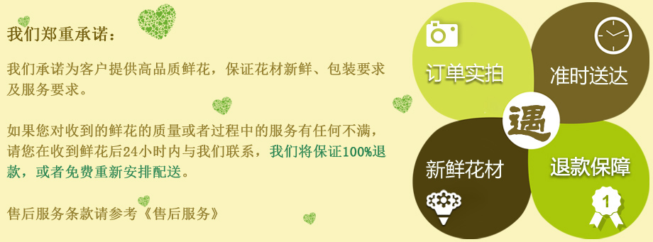 备注: 鲜花产品您至少应提前3小时下订单,我们保证按时送达; 为了能够有充分的时间准备,我们建议您尽量提前一天以上预定。