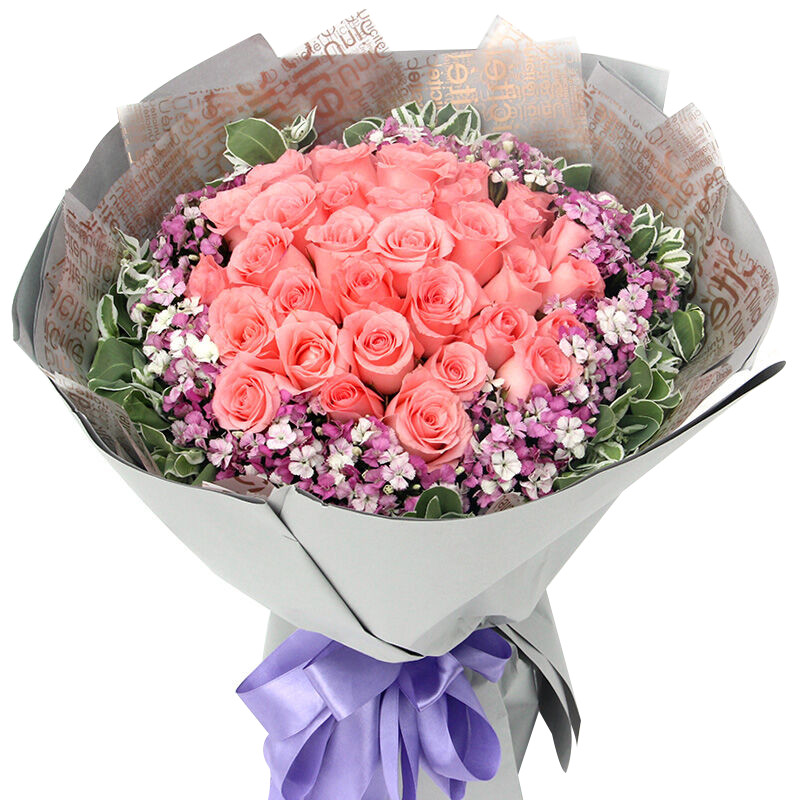 花材: 19朵戴安娜粉玫瑰,粉色满天星间插丰满。