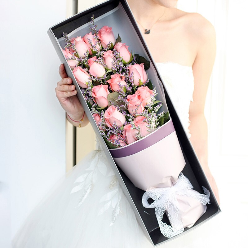 花 材:19朵戴安娜粉玫瑰,粉色满天星间插丰满。