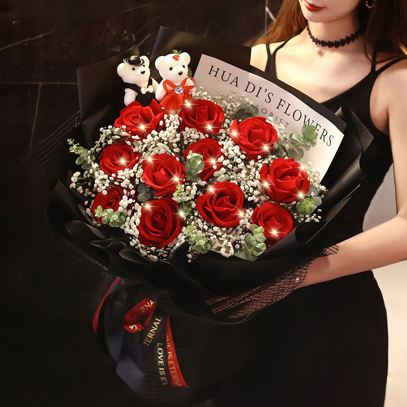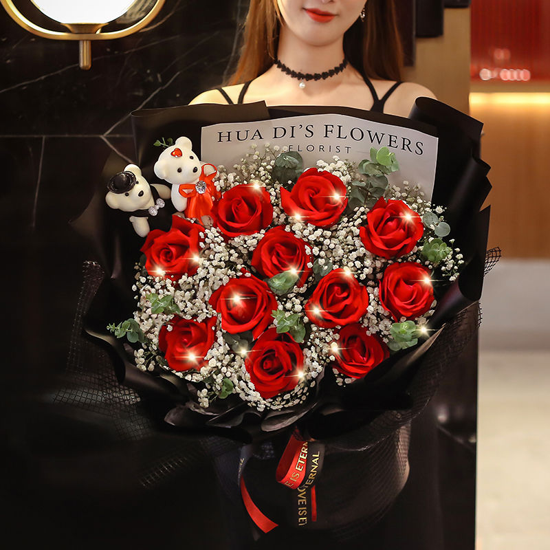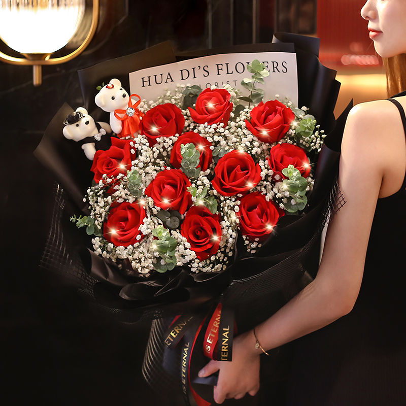 花 材:11枝红玫瑰,一对小熊(款式随机),一条灯串,搭配白色满天星,尤加利叶。