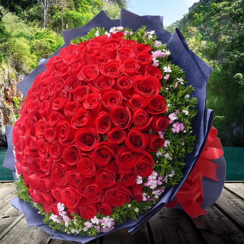 花材: 99支精品红玫瑰,搭配适量相思梅。