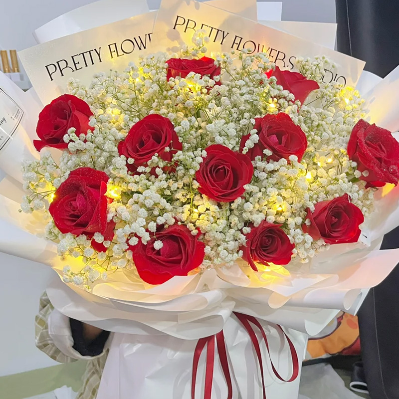 花材: 11枝红玫瑰,1条灯串,搭配白色满天星丰满间插。