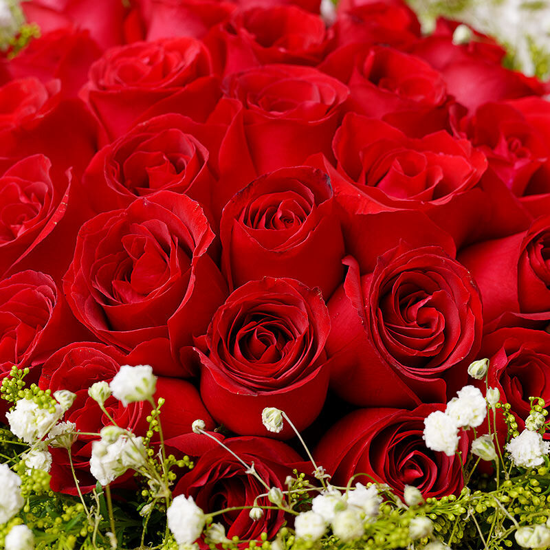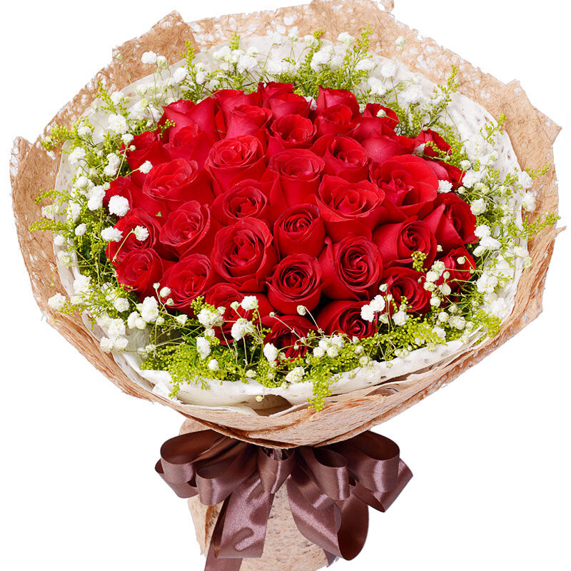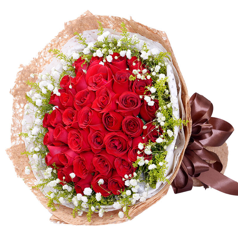 花 材:33支精品红玫瑰,外围搭配适量白色满天星、黄莺。