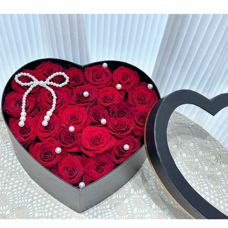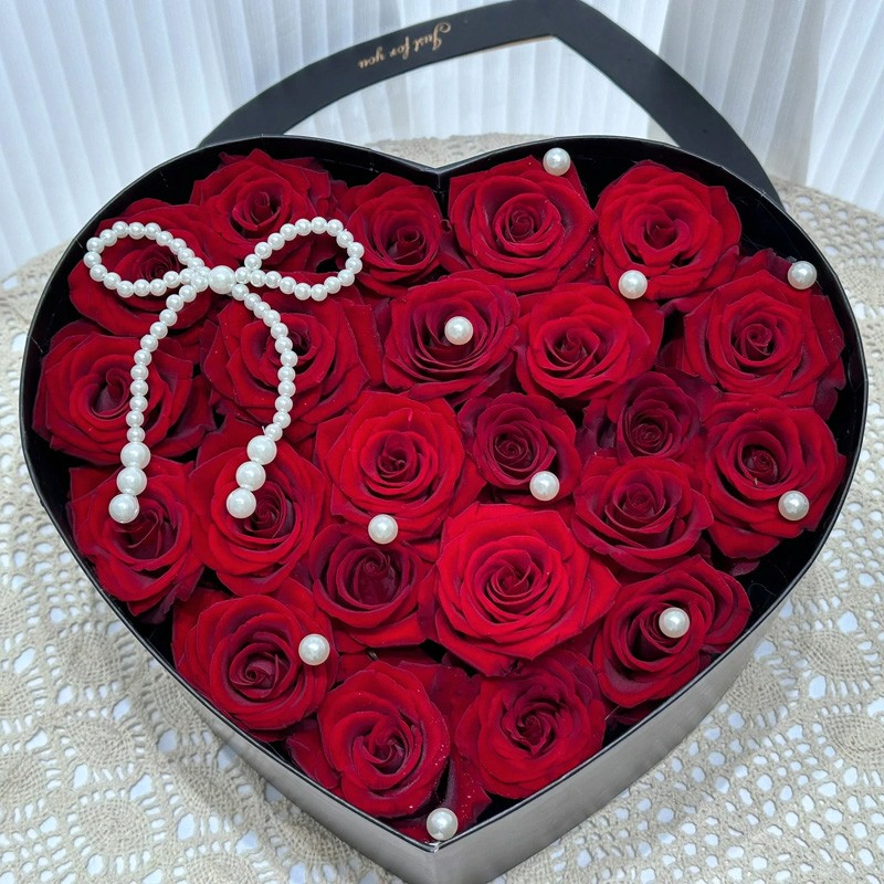 花 材:精选24朵红玫瑰,1条珠链系蝴蝶结,搭配珍珠钉装饰花面。