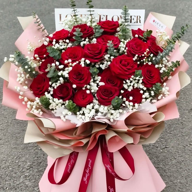 花 材:精选20枝红玫瑰,搭配尤加利叶、白色满天星装饰。