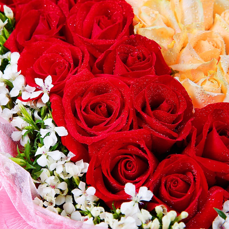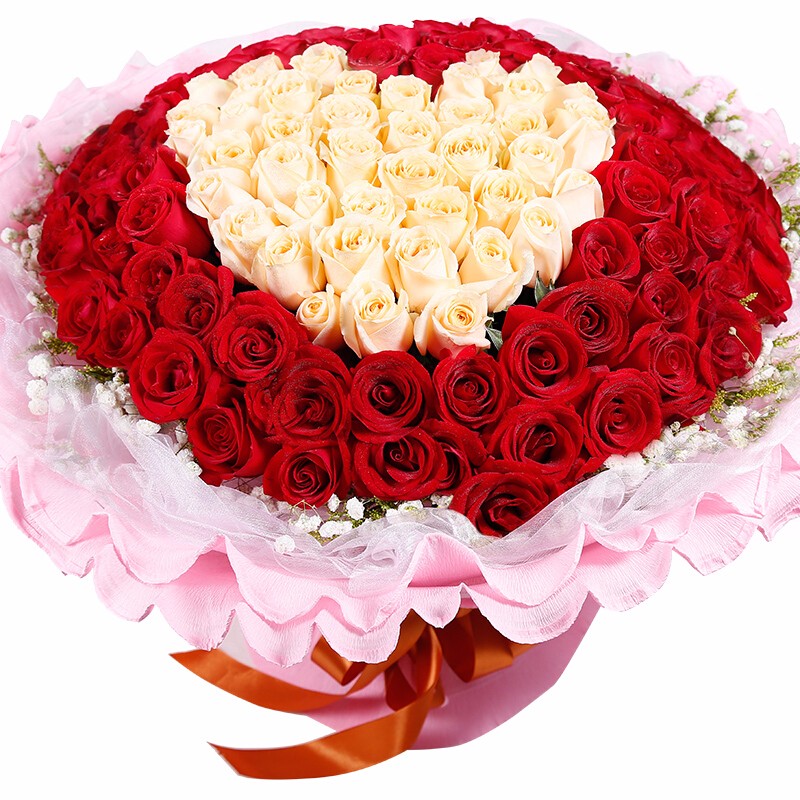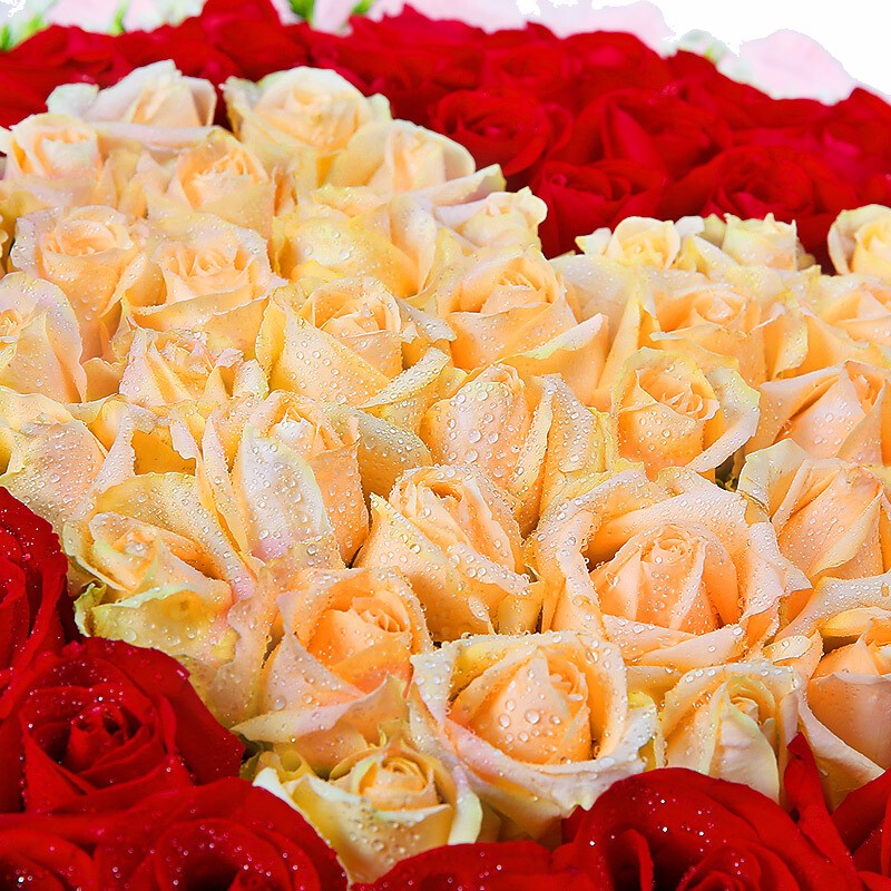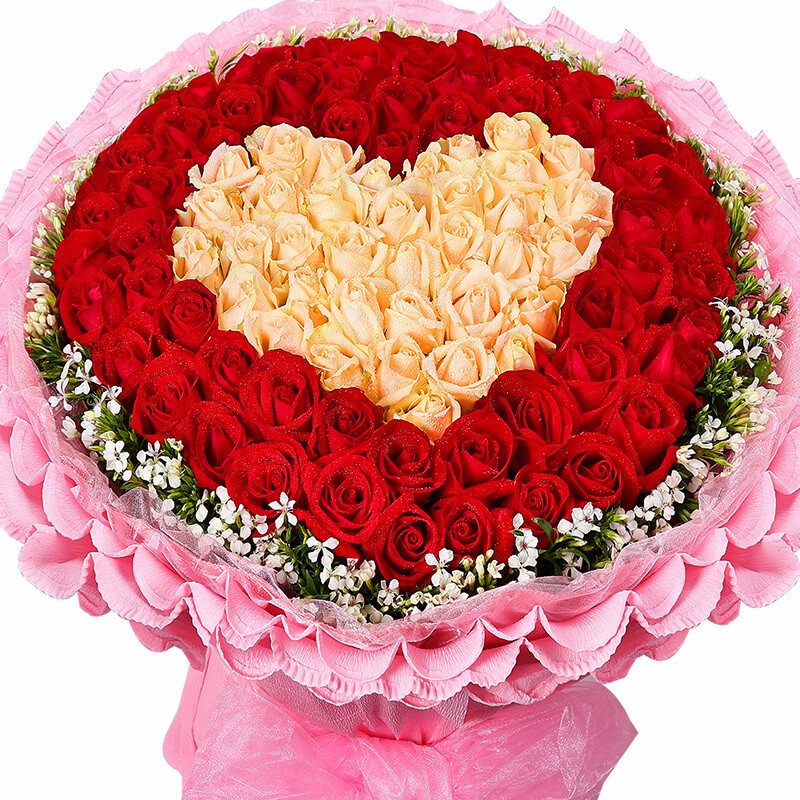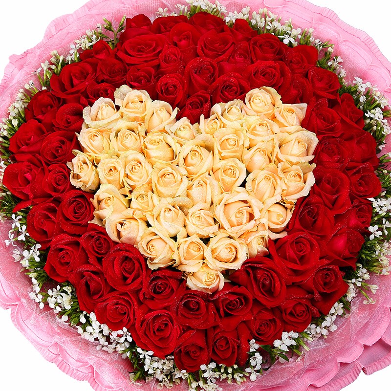 花 材:精选红玫瑰、香槟玫瑰共99朵,香槟玫瑰围成心形,外围相思梅点缀。