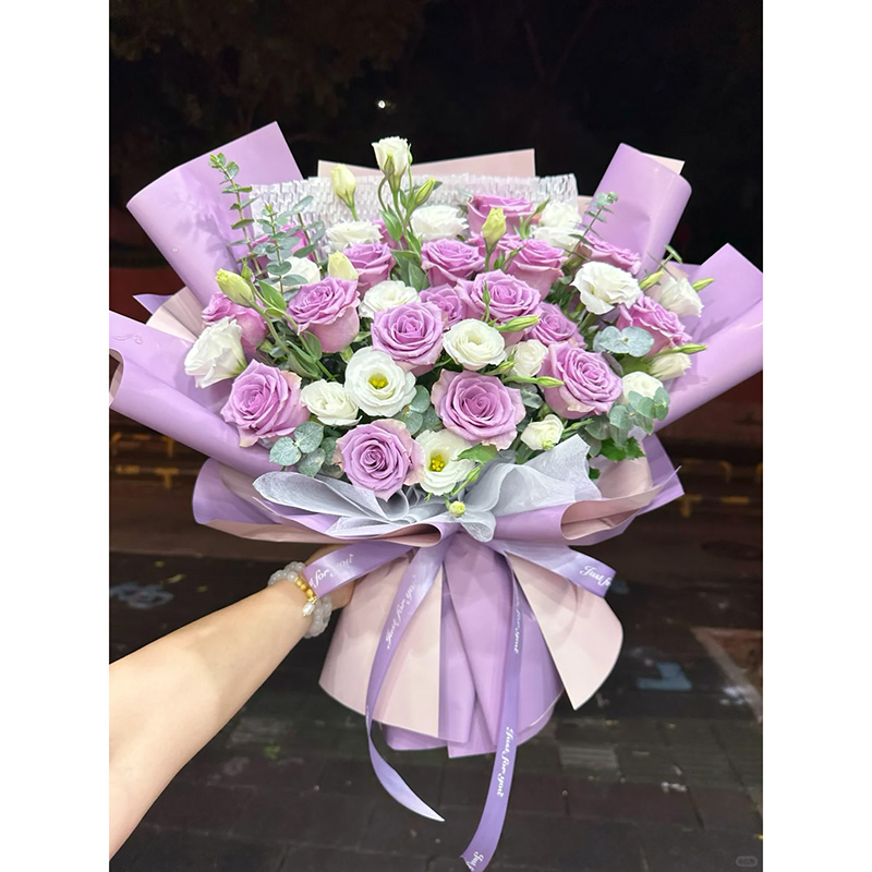 花材: 精选19朵紫霞仙子紫玫瑰,6支多头浅色洋桔梗,搭配尤加利叶装饰。