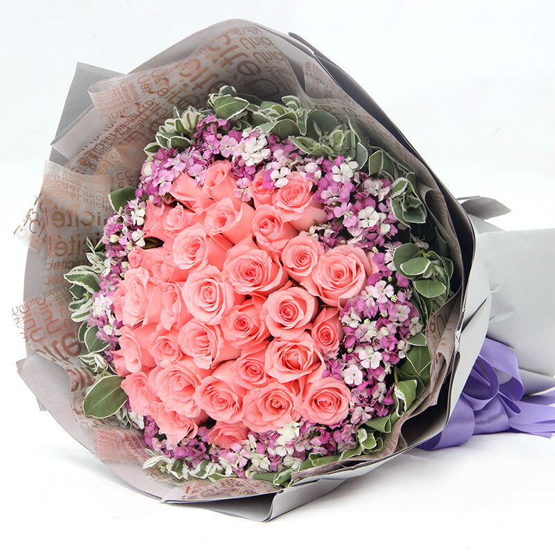 花材: 33支精品粉玫瑰,外围搭配适量叶上花、相思梅。