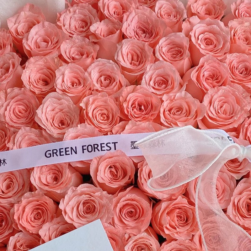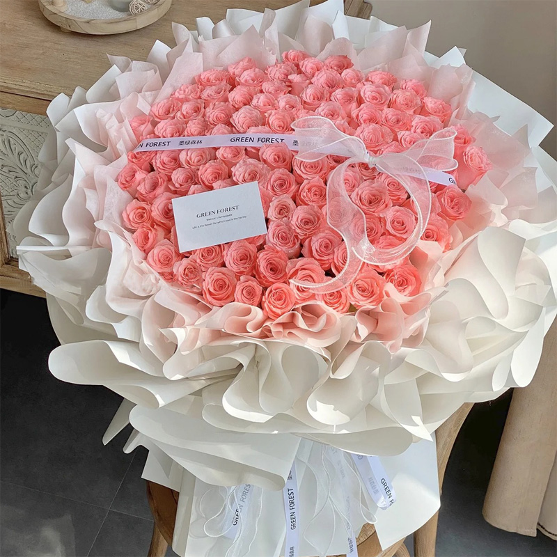 花 材:精选99朵粉玫瑰,1条缎带系蝴蝶结装饰花面。