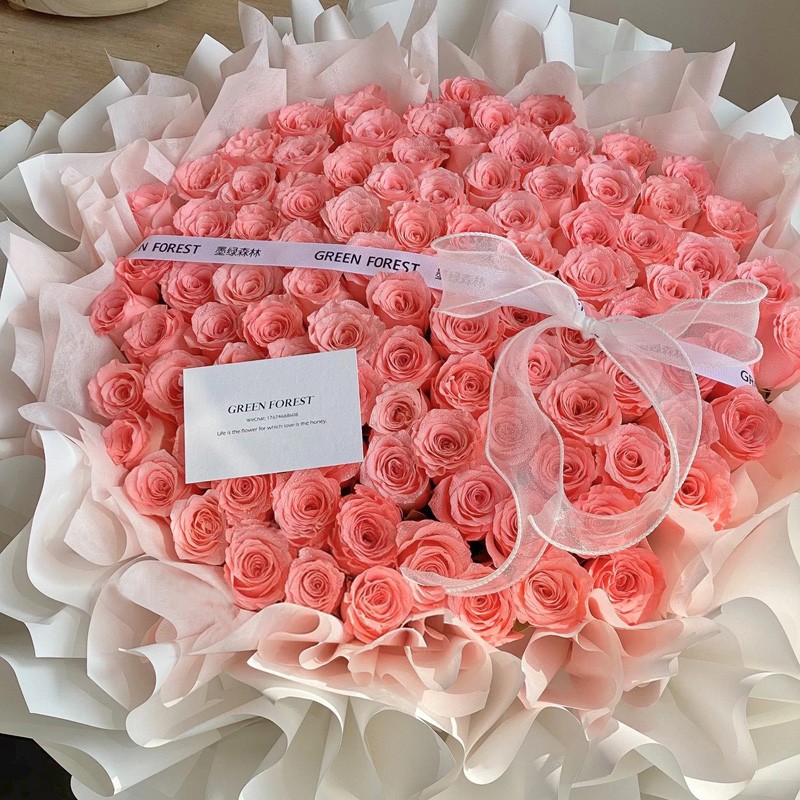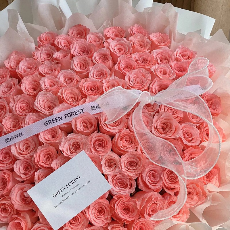花材: 精选99朵粉玫瑰,1条缎带系蝴蝶结装饰花面。