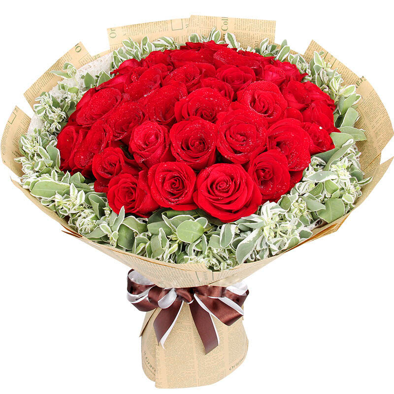 花 材:33朵精品红玫瑰,叶上花丰满搭配。