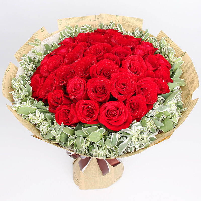 花材: 33朵精品红玫瑰,叶上花丰满搭配。