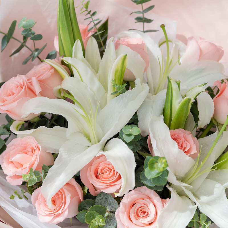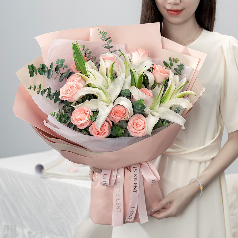 花材: 精选11朵粉玫瑰、多头白色香水百合2枝、尤加利叶装饰。