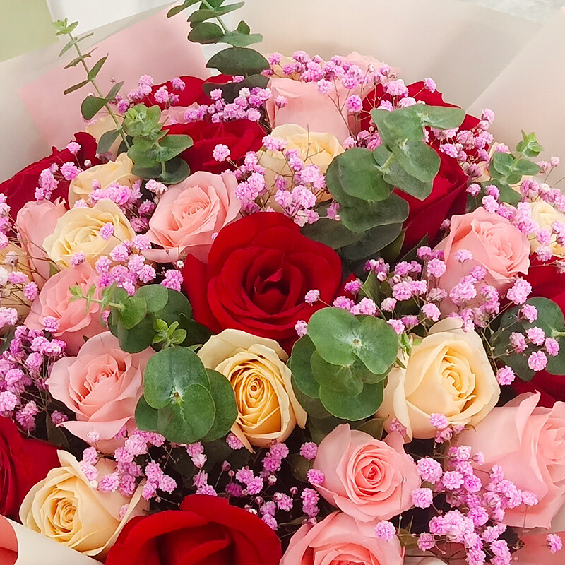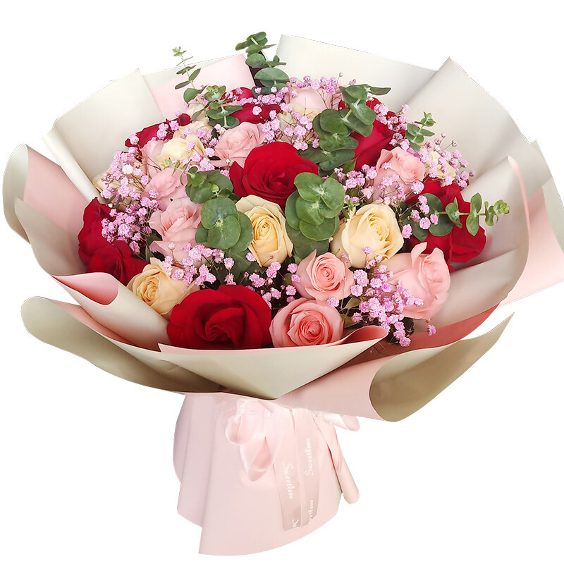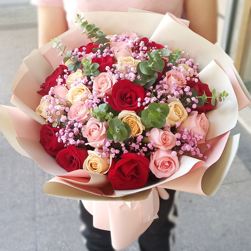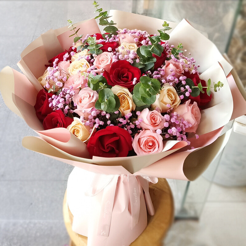 花材: 33朵玫瑰混搭(11朵香槟玫瑰,11朵粉玫瑰,11朵红玫瑰),尤加利叶,粉色满天星装饰。