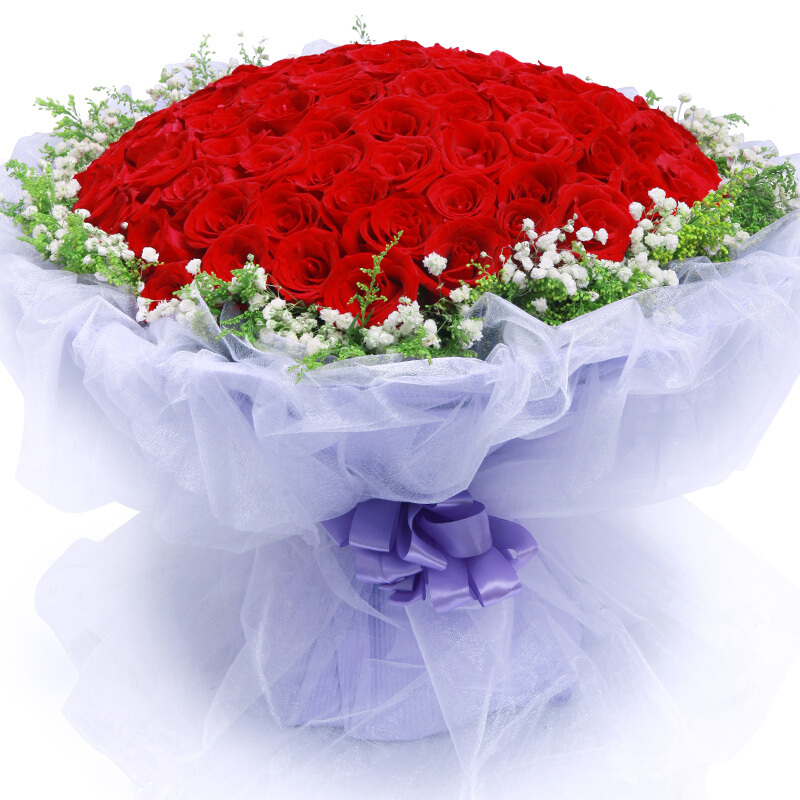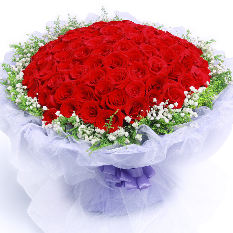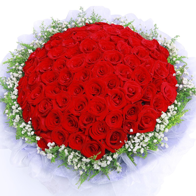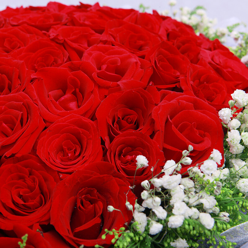 花材: 精选顶级99朵红玫瑰,黄莺、满天星围绕。