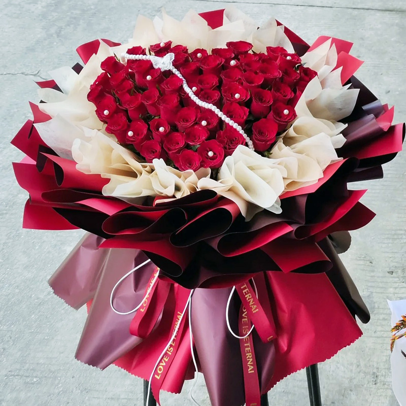 花 材:精心挑选52朵红玫瑰,1条珠串,珍珠工艺品装饰花面。
