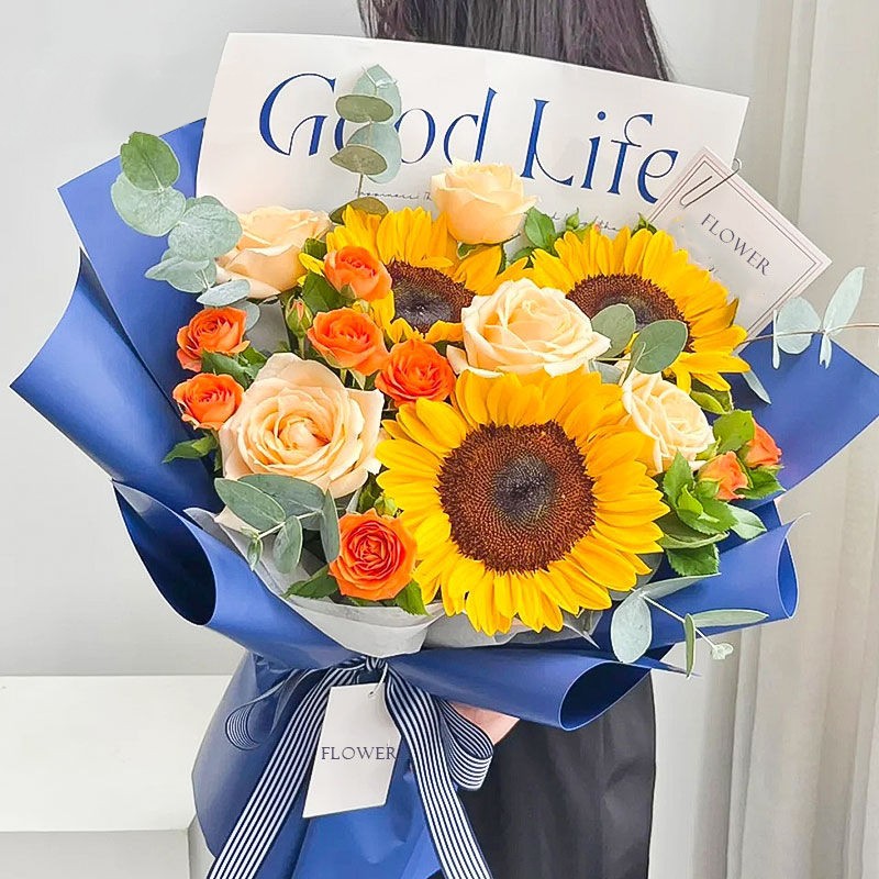 花材: 3枝向日葵、5枝香槟玫瑰、3枝橙色多头玫瑰、尤加利叶点缀