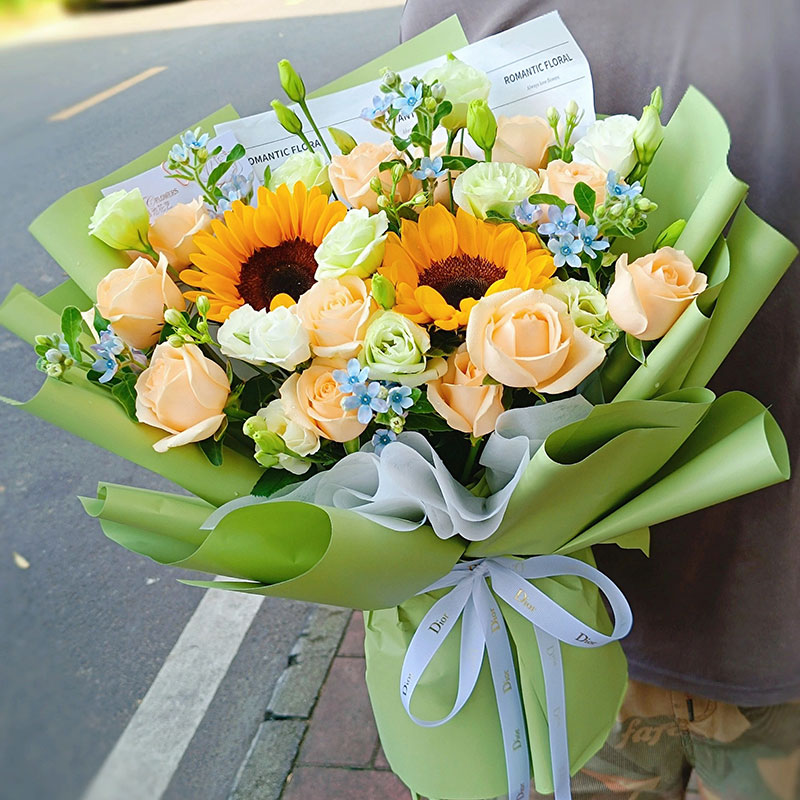 花 材:2朵向日葵,11朵香槟玫瑰,5支洋桔梗,搭配蓝星花装饰。(蓝星花为季节性花材,非应季则替换为其他配花来保证花束效果)
