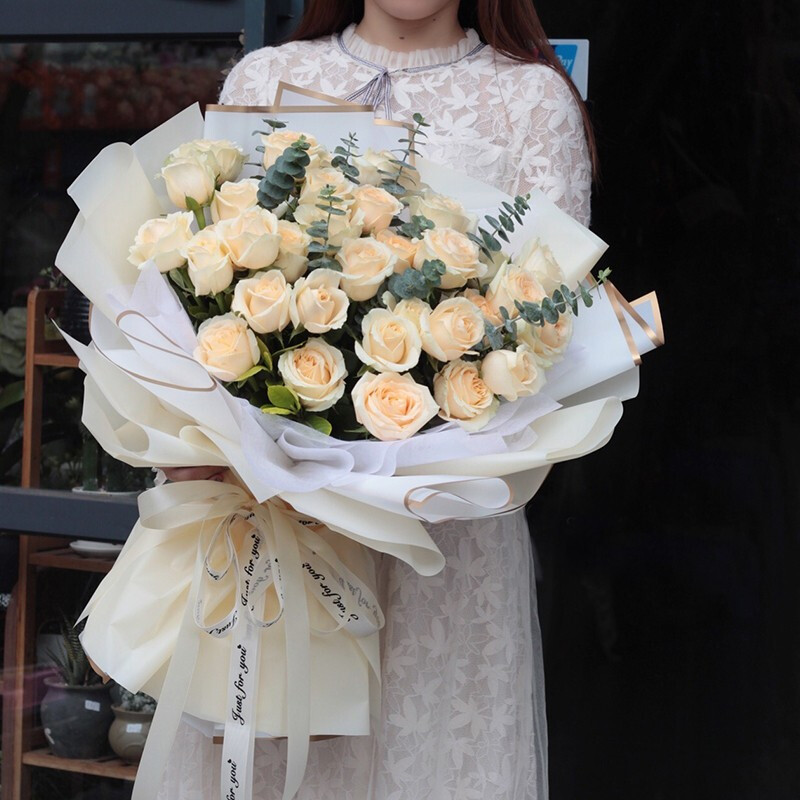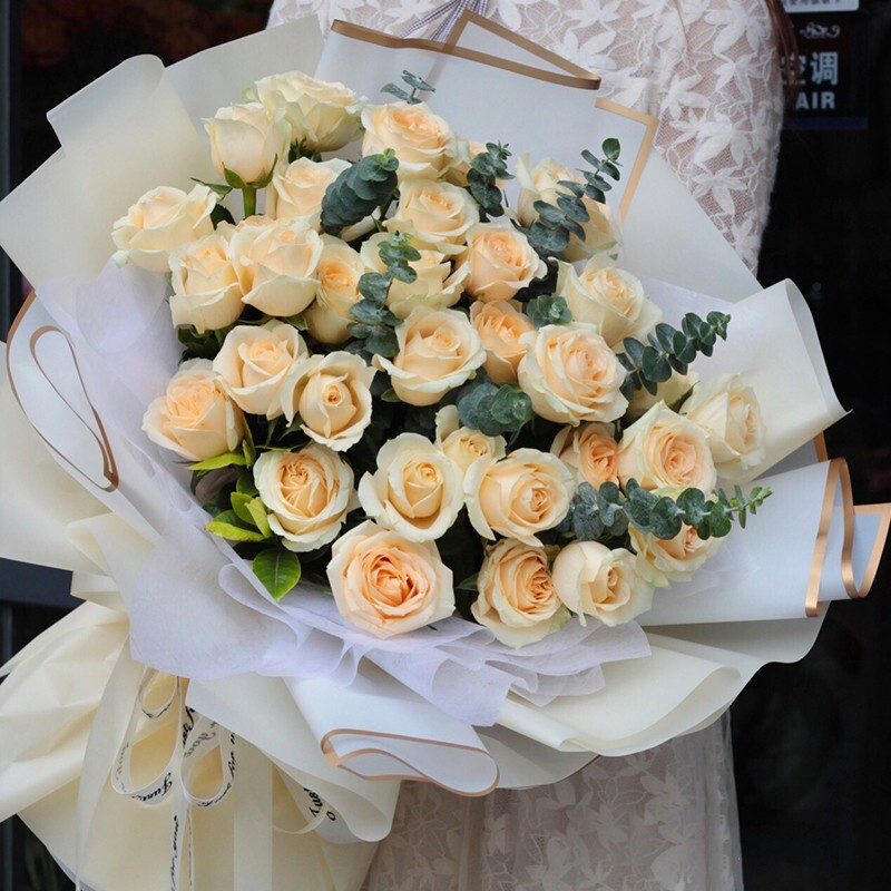 花 材:33朵精品香槟玫瑰,尤加利叶装饰。