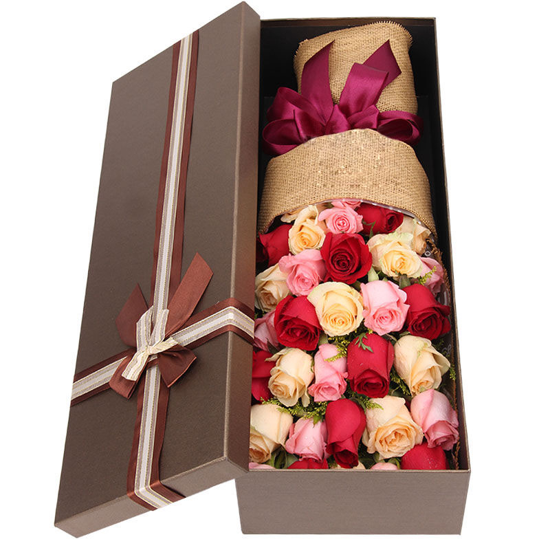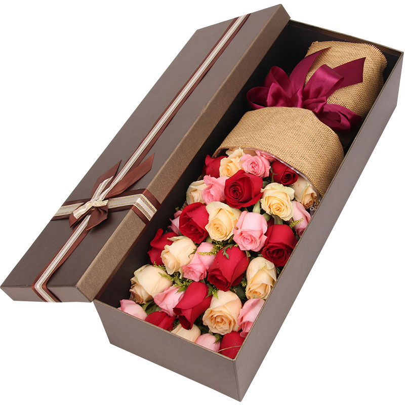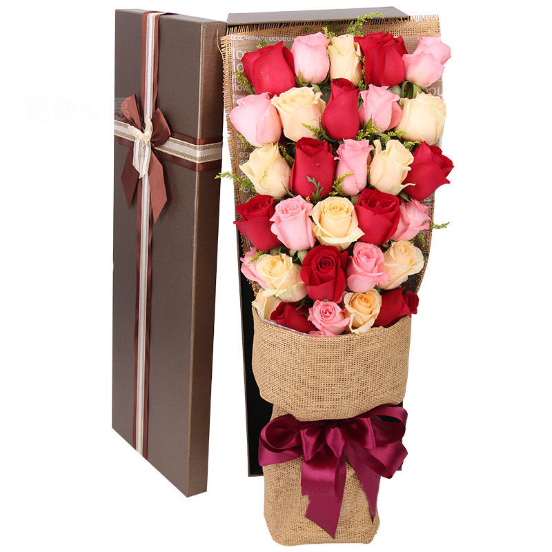 花材: 11朵红玫瑰,11朵香槟玫瑰,11朵粉玫瑰共33朵,黄莺搭配。