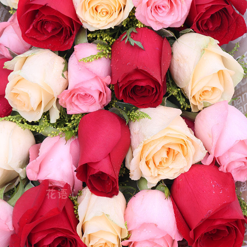 花 材: 11朵红玫瑰,11朵香槟玫瑰,11朵粉玫瑰共33朵,黄莺搭配。