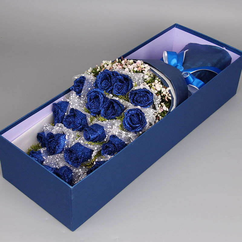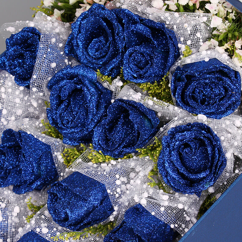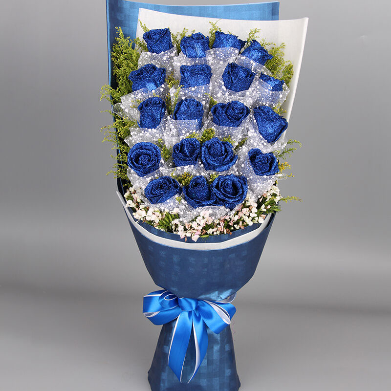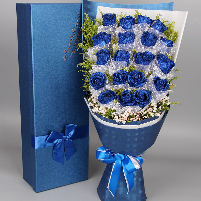 包装: 雪点纱单支包装花朵 ,内层白色牛油纸,外层蓝色格子平面纸(如图包装),白色+蓝色缎带花结束扎。长方形蓝色礼盒。