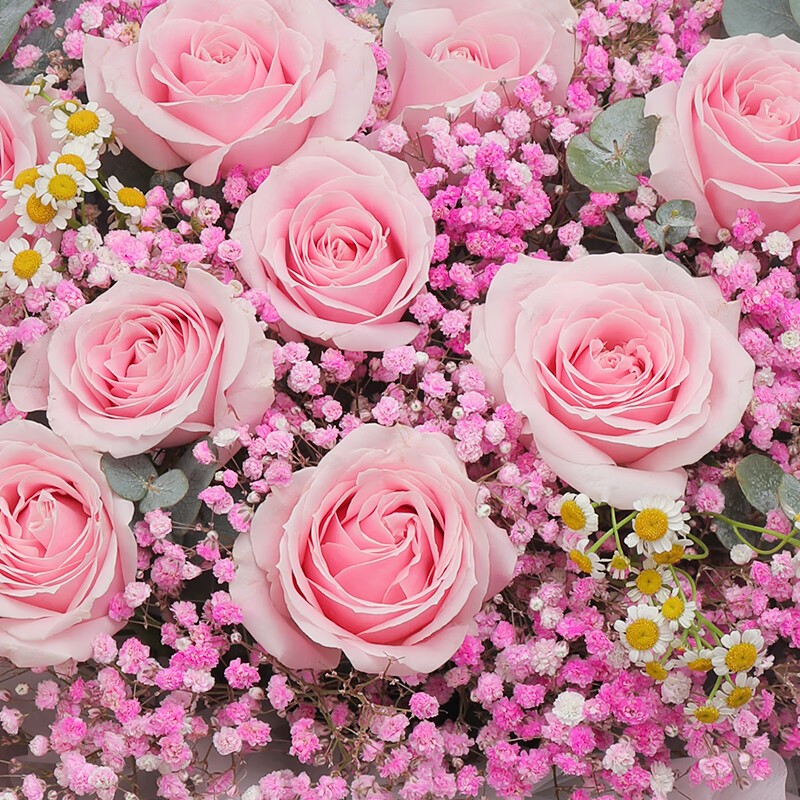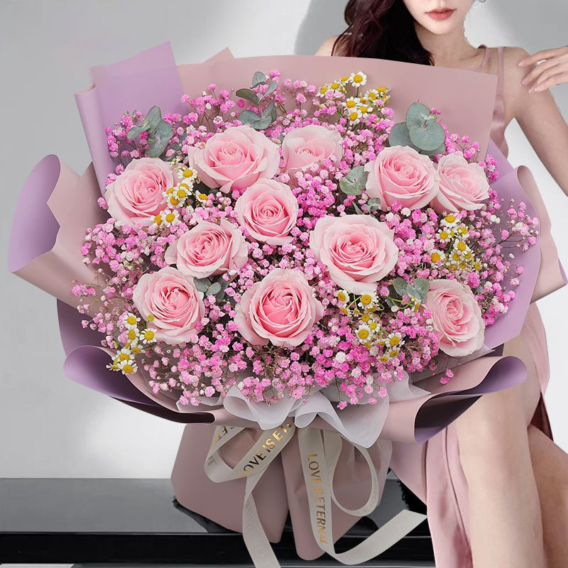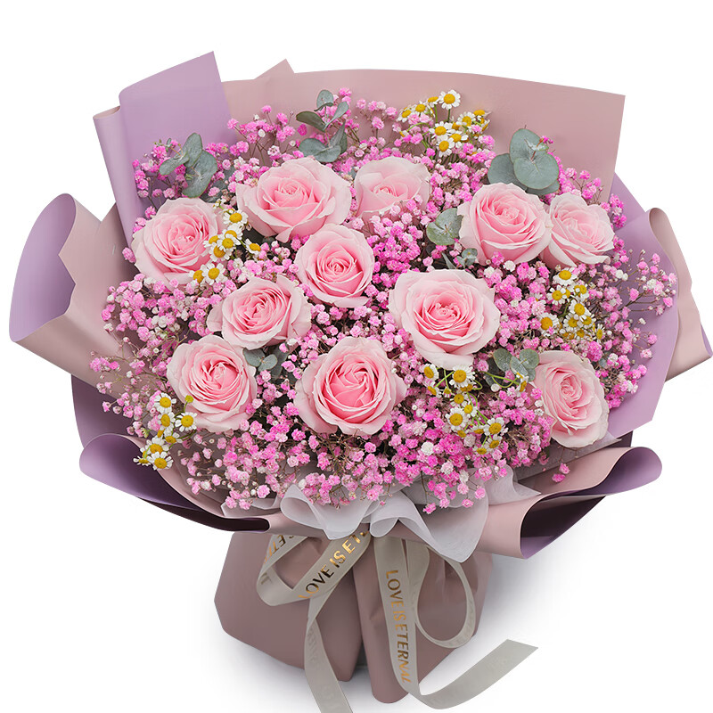 花 材:精选11朵粉玫瑰,搭配粉色满天星,尤加利叶,洋甘菊装饰。