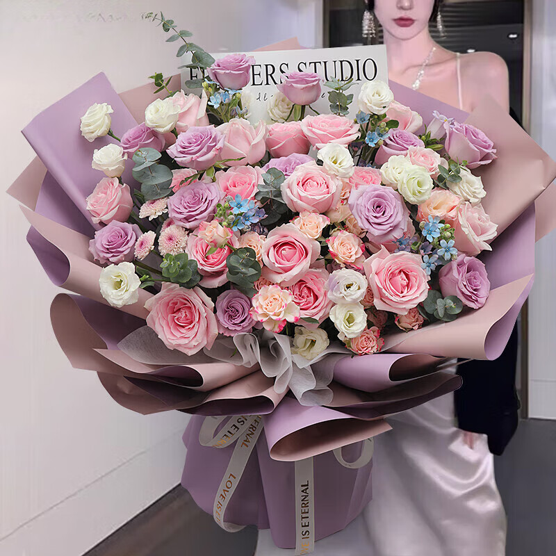 花 材:粉玫瑰、紫玫瑰共33朵,搭配多头折射小玫瑰,洋桔梗,小雏菊,蓝星花,尤加利装饰。