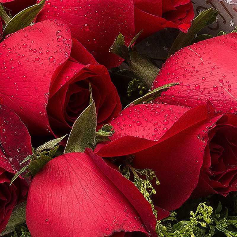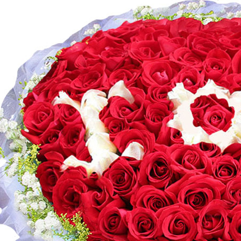花材: 精选红玫瑰、白玫瑰共99枝,白玫瑰中间围成IOU的图案,外围满天星黄莺点缀。