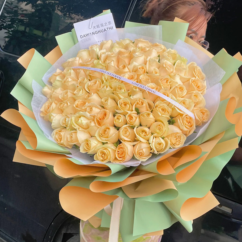花材: 99朵香槟玫瑰,搭配缎带装饰花面。