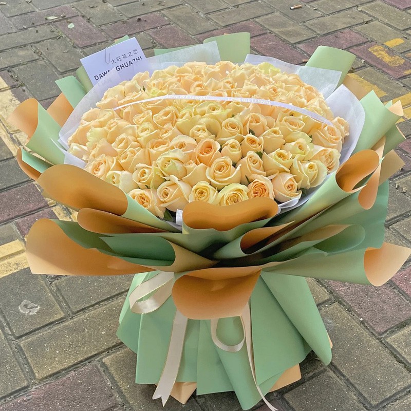 花 材:99朵香槟玫瑰,搭配缎带装饰花面。