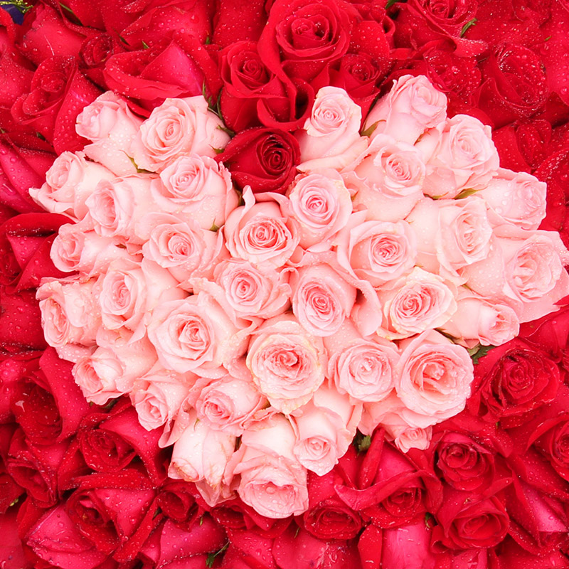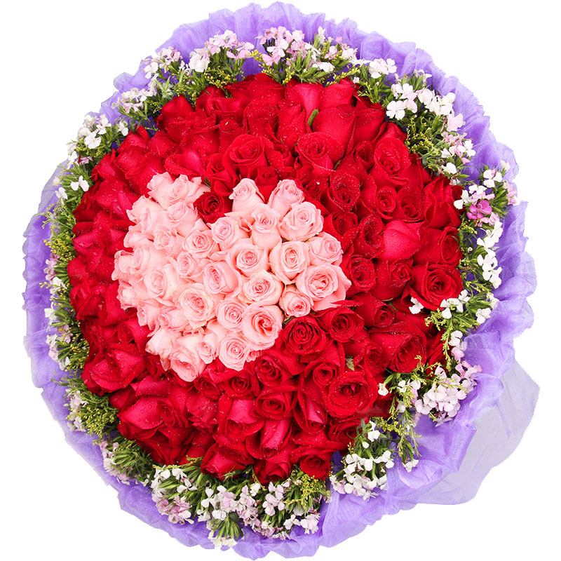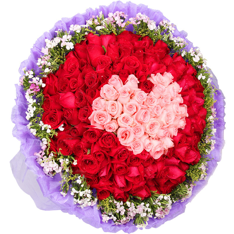 花材: 99朵玫瑰(33朵精品粉玫瑰,66朵精品红玫瑰),搭配黄莺、相思梅