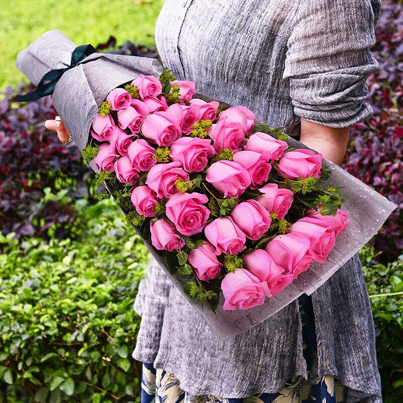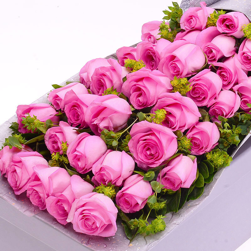 花 材:33支精品粉玫瑰,搭配适量叶上黄金。