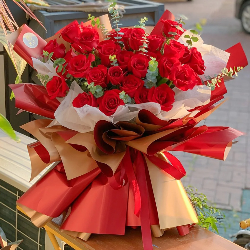 花 材:33朵红玫瑰松散包装,尤加利叶间插装饰。